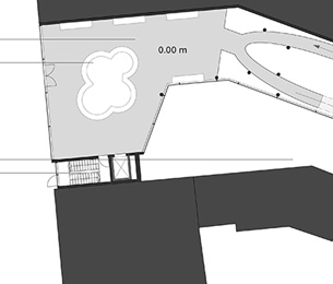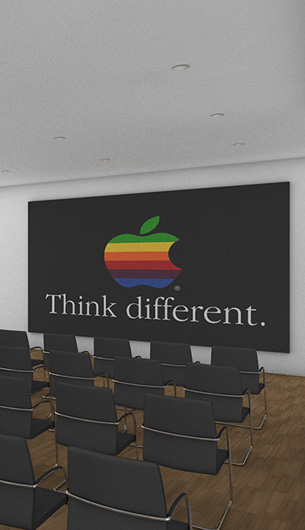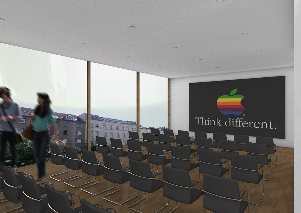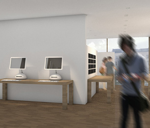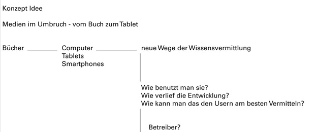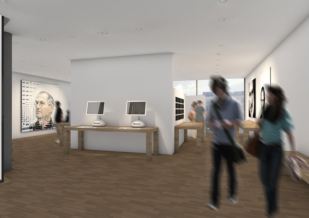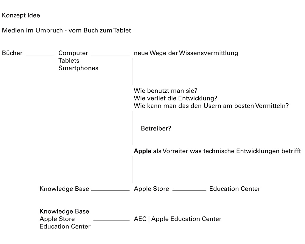 Ähnlich wie beim Spross entwickeln sich auch hier die verschiedenen Ebenen um einen "Stamm" nach links und rechts. Der Stamm ist in diesem Entwurfs das Erschließungselement - eine Rampemanlage, die die Nutzer zu den verschiedenen Ebenen begibt. Auf den Ebenen selbst findet der Besucher multimediale Informationen zur Entwicklung Medien Technik speziell der von Apple.