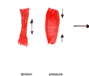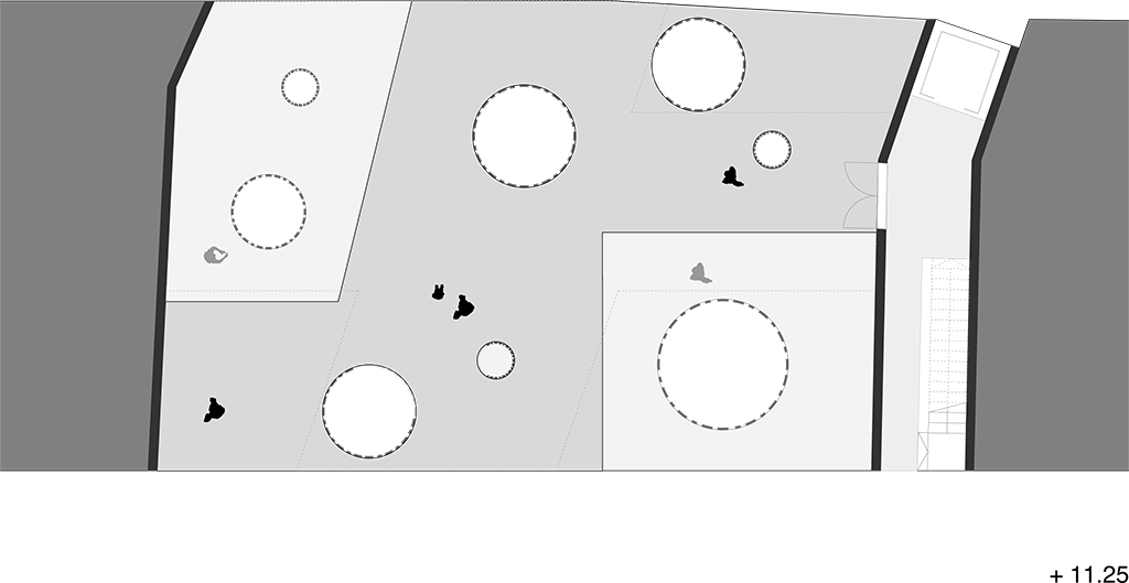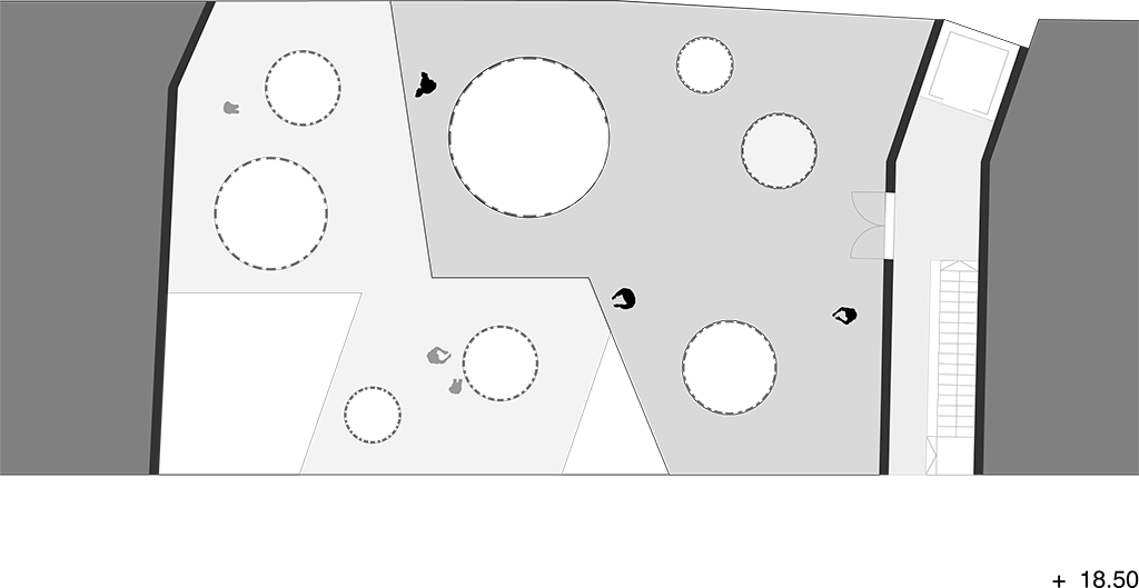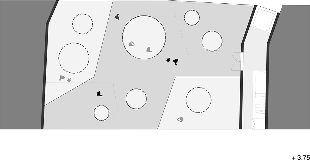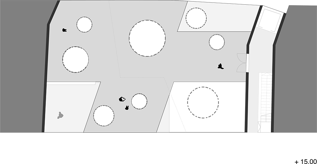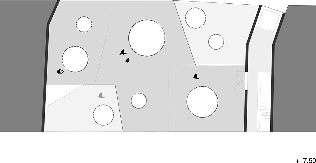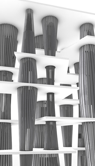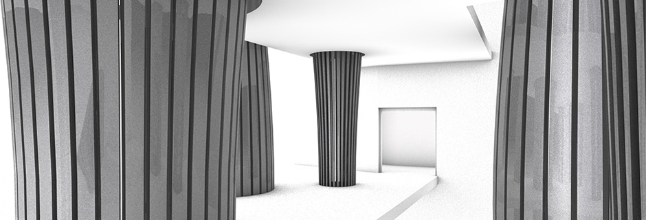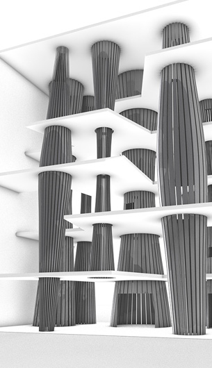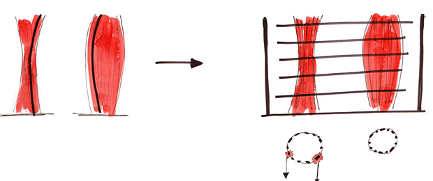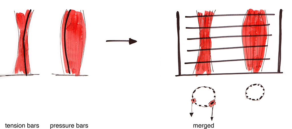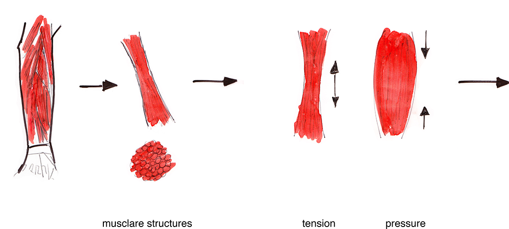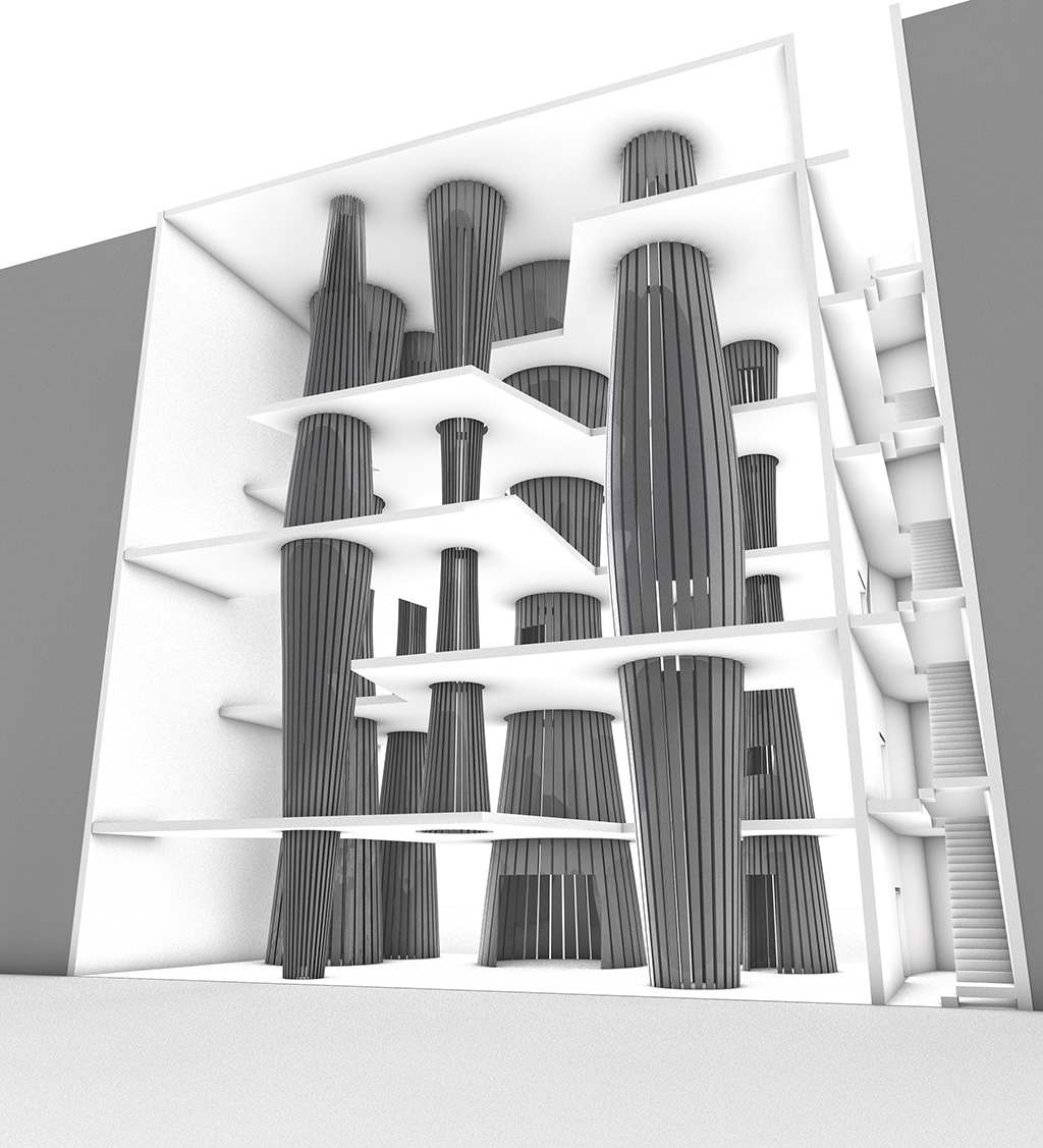 Die Grundlage des Entwurfs sind die Muskeln die auf Druck bzw. Zug reagieren können. Dementsprechend wurden neue "Stützen" geschaffen, an denen zu einem Teil die Decken hängen und zum anderen Teil aufliegen. Durch geschickte Anordnung der Stützen sowie Platzierung von Öffnungen kann der Besucher interaktiv an der Statik des Gebäudes Teilhaben.