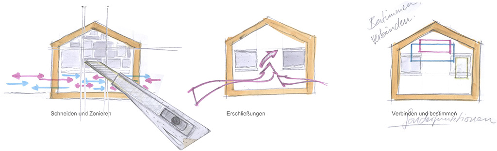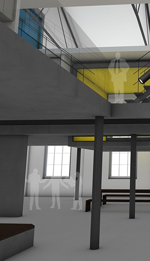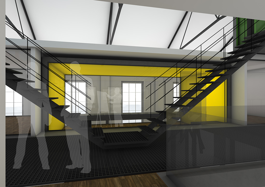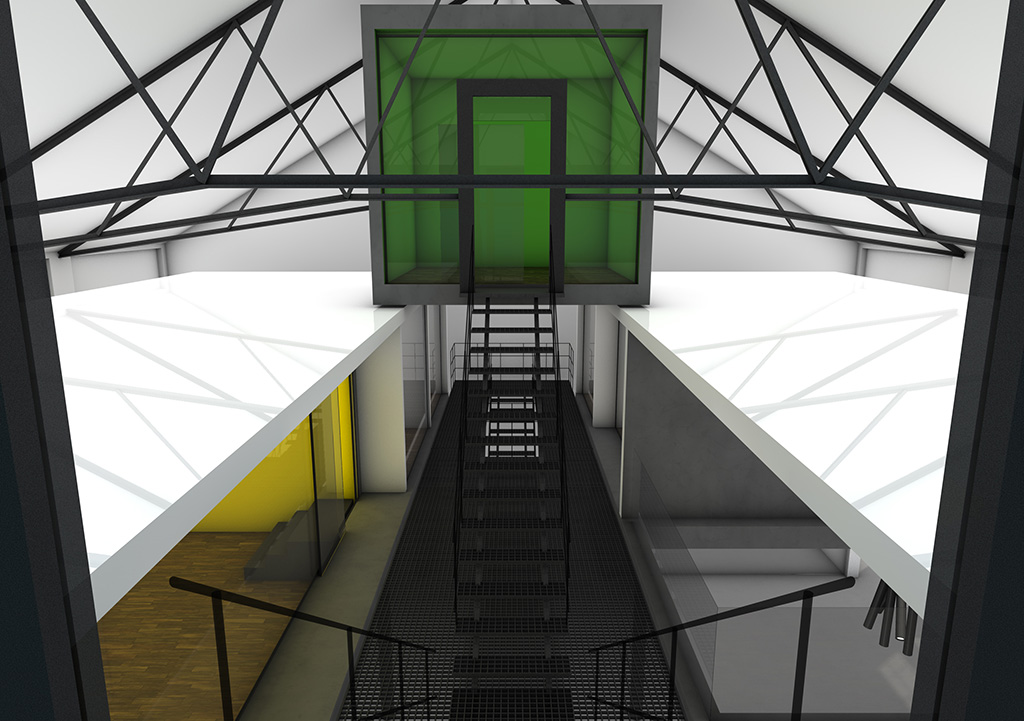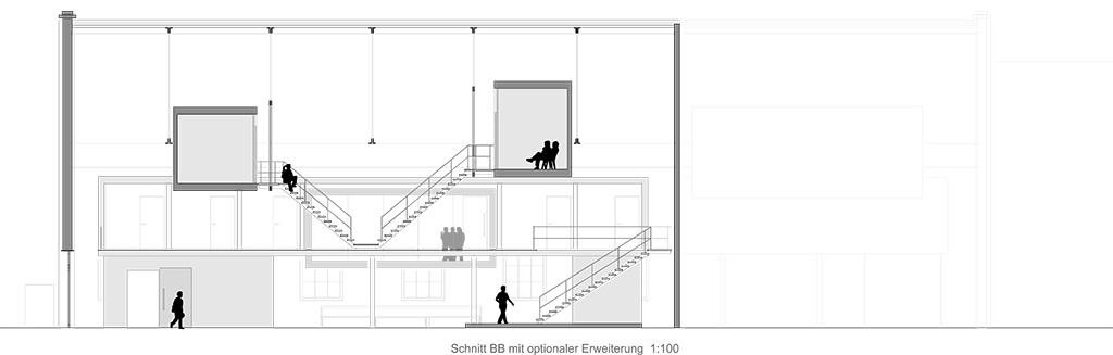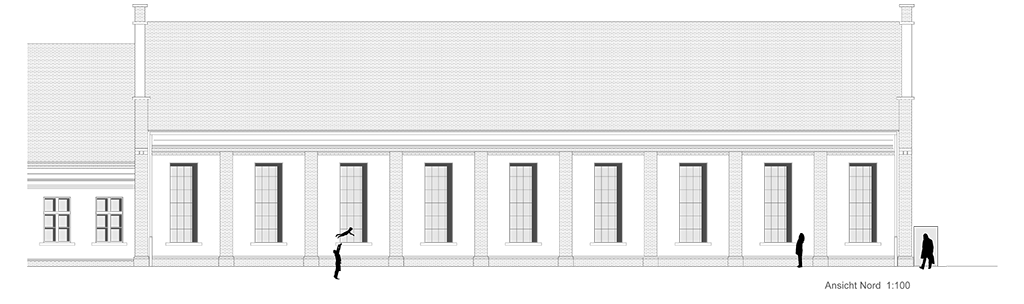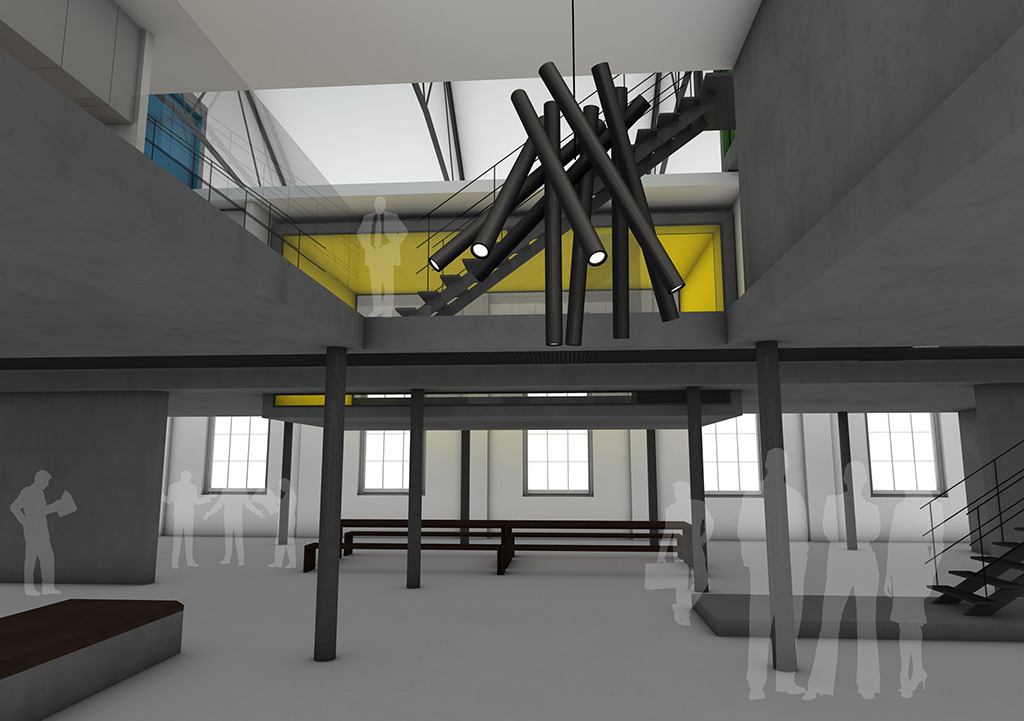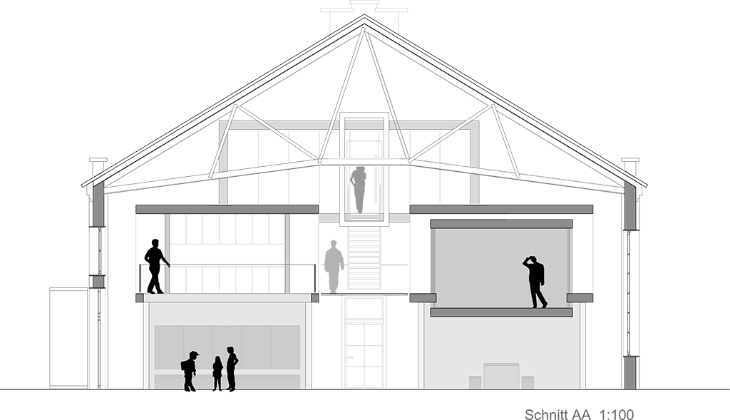 Der Entwurf zeigt grössten Respekt vor dem Alten und bildet im neuen "Rahmen", eingerückt von der Gebäudekubatur, eine neue innere Welt, die mit der alten einhergeht und zusammen arbeitet. Nach aussen zeigt sich der Eingriff bautechnisch lediglich in der Erneuerung bzw. einer Vereinheitlichung der Fensteröffnungen. Die grossformatigen Werkstatttore werden erhalten und formulieren die Erschliessung über die ostwestliche Längsseite. Die Geschosse bilden und trennen die funktionellen Ordnungen. Der zweigeschossige Erschliessungsstreifen in Längsrichtung des Gebäudes zoniert die Funktionen. Drei Räume mit Sonderfunktionen zeigen ihre Sonderstellung durch "Störungen" in der bundartigen Raumorganisation. Sie durchstoßen, berühren und stehen zwischen dem erhaltenen Dachtragwerk. Die Atmosphäre des Bestandsgebäudes wird durch das Funktionsprinzip, die Grundrissorganisationen und Materialwahl erhalten und bildet eine Synergie aus Alt und Neu. Das Raster des "Einbaus" bezieht sich auf die bestehende Struktur. Die Primärstruktur besteht aus tragenden Stahlbetonmauerscheiben und Stahlstützen. Die Decken werden als Aufbetonkonstruktion erstellt. Sonstige Wände werden als hochschalldämmender Trockenbau ausgeführt. Der Erschliessungsbund mit Steg und Treppen wird als Stahlkonstruktion mit minimierten Querschnitten errichtet.