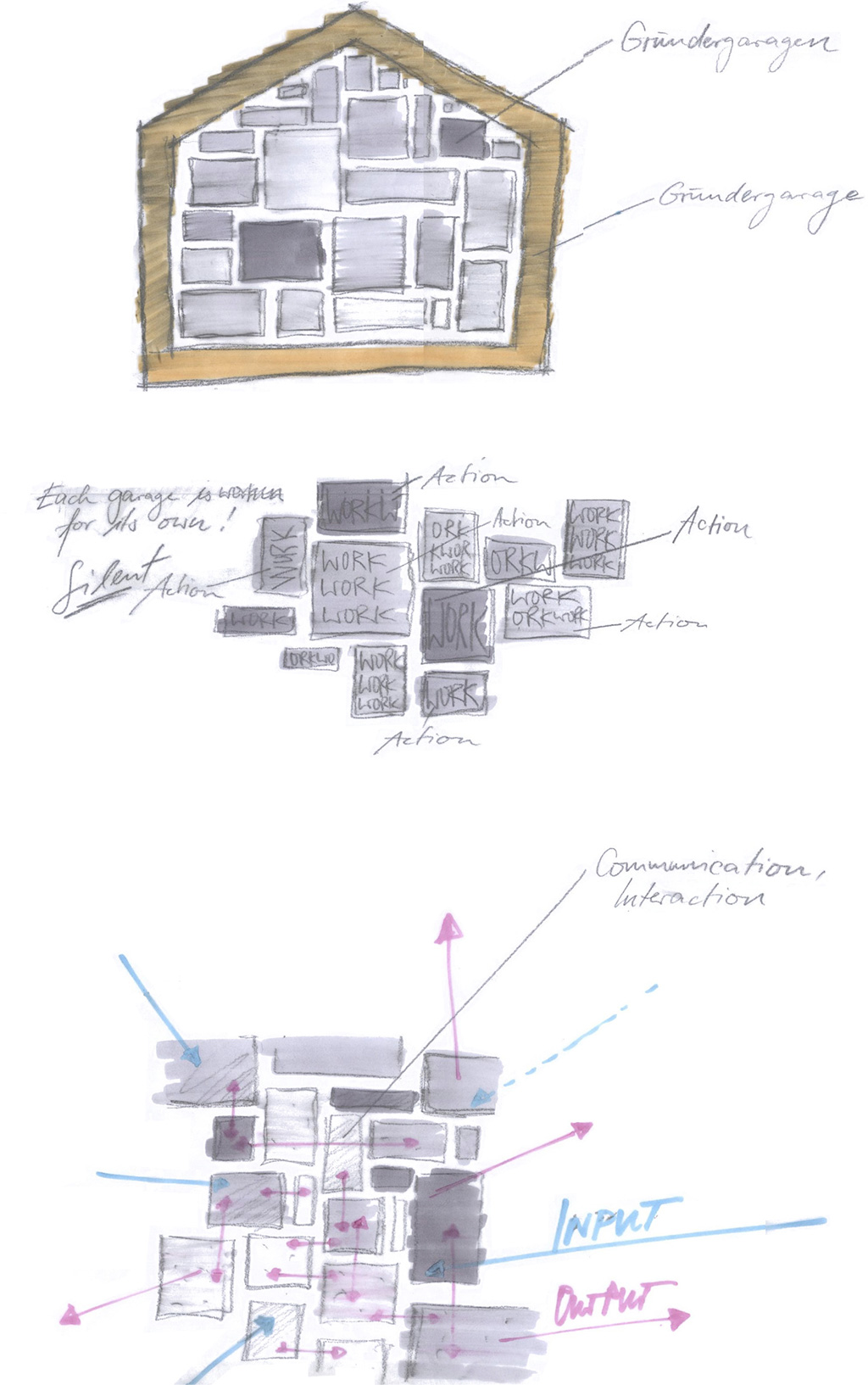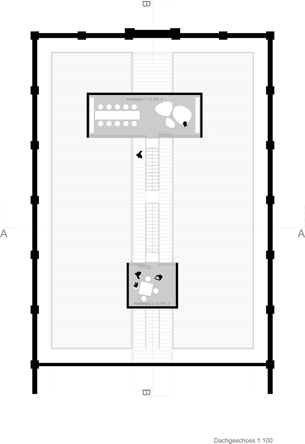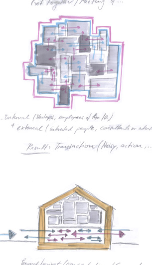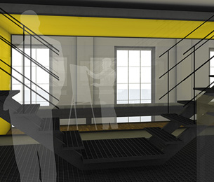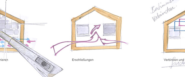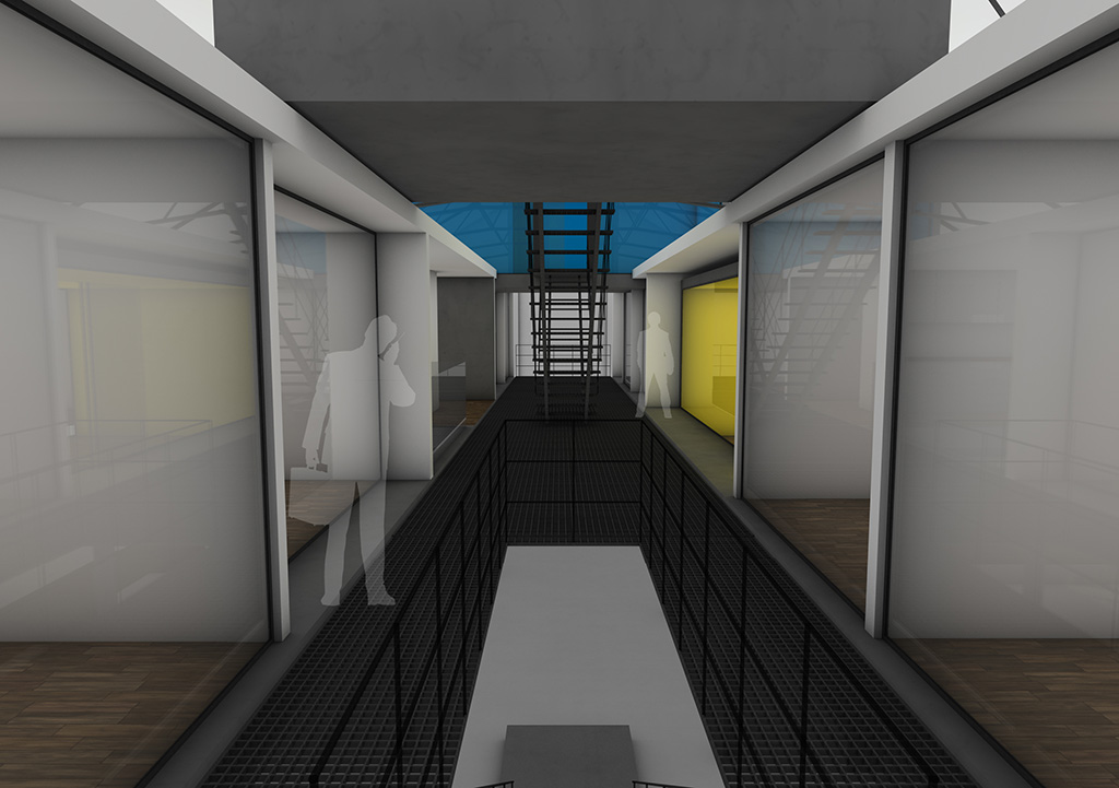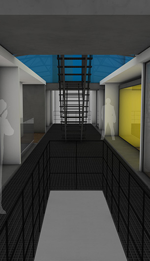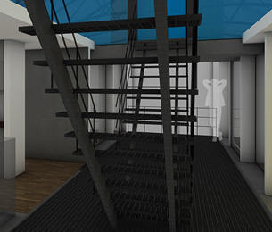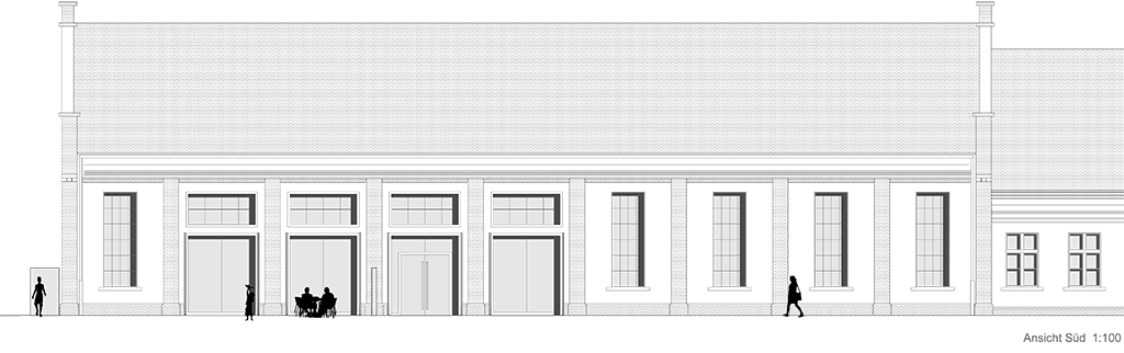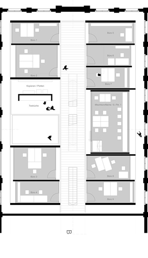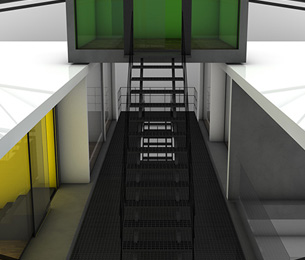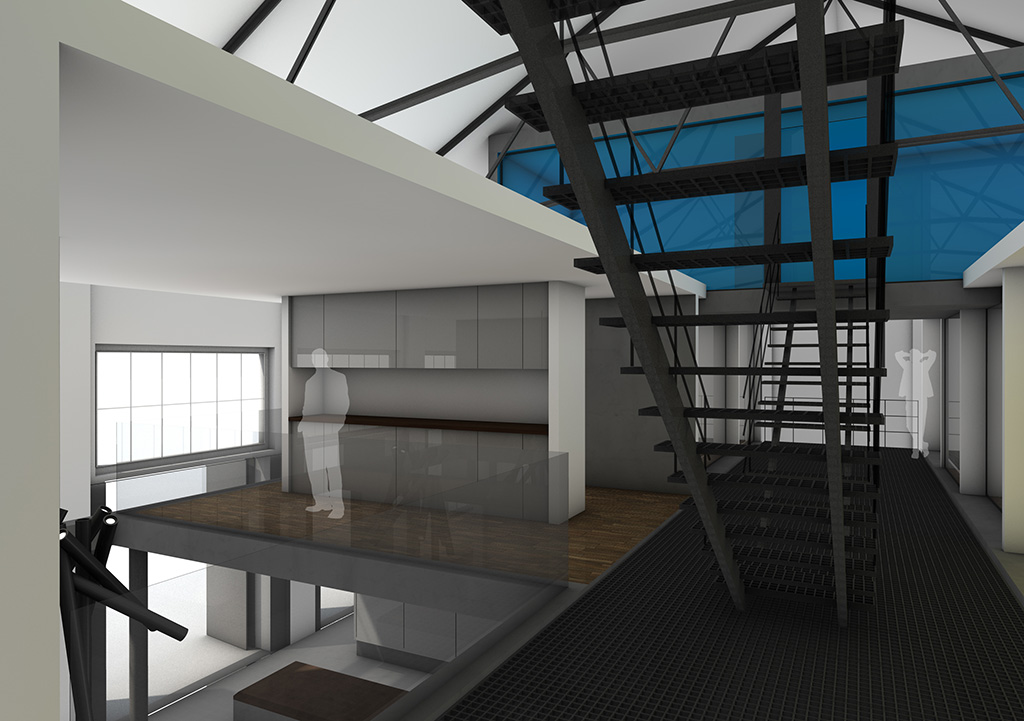 Der Entwurf zeigt grössten Respekt vor dem Alten und bildet im neuen "Rahmen", eingerückt von der Gebäudekubatur, eine neue innere Welt, die mit der alten einhergeht und zusammen arbeitet. Nach aussen zeigt sich der Eingriff bautechnisch lediglich in der Erneuerung bzw. einer Vereinheitlichung der Fensteröffnungen. Die grossformatigen Werkstatttore werden erhalten und formulieren die Erschliessung über die ostwestliche Längsseite. Die Geschosse bilden und trennen die funktionellen Ordnungen. Der zweigeschossige Erschliessungsstreifen in Längsrichtung des Gebäudes zoniert die Funktionen. Drei Räume mit Sonderfunktionen zeigen ihre Sonderstellung durch "Störungen" in der bundartigen Raumorganisation. Sie durchstoßen, berühren und stehen zwischen dem erhaltenen Dachtragwerk. Die Atmosphäre des Bestandsgebäudes wird durch das Funktionsprinzip, die Grundrissorganisationen und Materialwahl erhalten und bildet eine Synergie aus Alt und Neu. Das Raster des "Einbaus" bezieht sich auf die bestehende Struktur. Die Primärstruktur besteht aus tragenden Stahlbetonmauerscheiben und Stahlstützen. Die Decken werden als Aufbetonkonstruktion erstellt. Sonstige Wände werden als hochschalldämmender Trockenbau ausgeführt. Der Erschliessungsbund mit Steg und Treppen wird als Stahlkonstruktion mit minimierten Querschnitten errichtet.