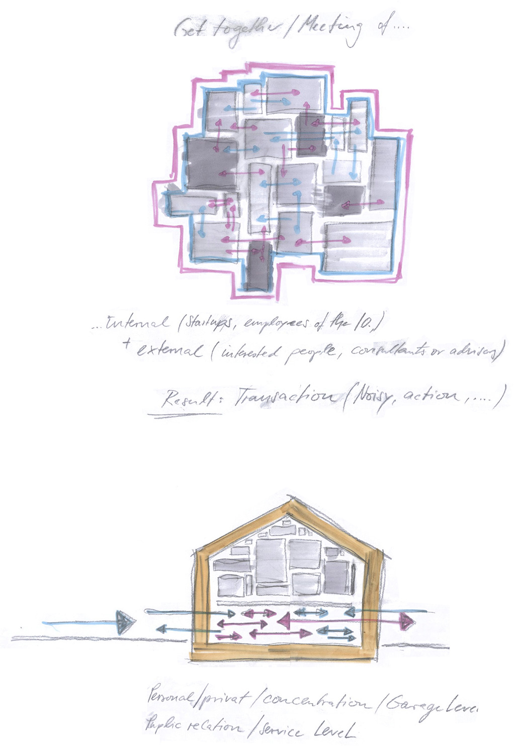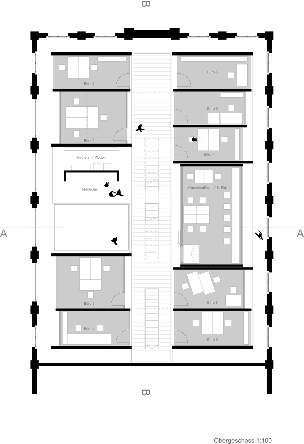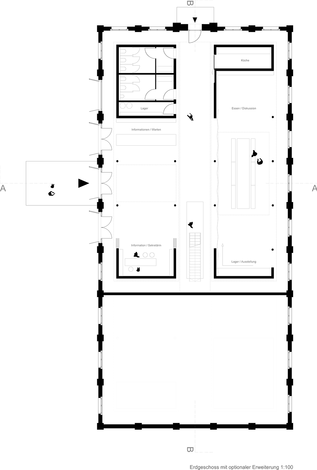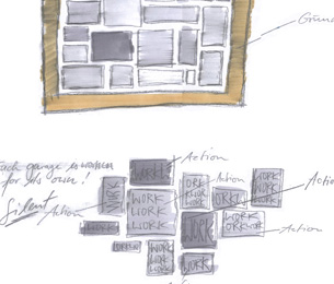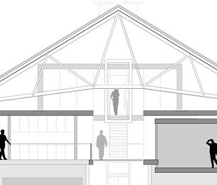 Der Entwurf zeigt grössten Respekt vor dem Alten und bildet im neuen "Rahmen", eingerückt von der Gebäudekubatur, eine neue innere Welt, die mit der alten einhergeht und zusammen arbeitet. Nach aussen zeigt sich der Eingriff bautechnisch lediglich in der Erneuerung bzw. einer Vereinheitlichung der Fensteröffnungen. Die grossformatigen Werkstatttore werden erhalten und formulieren die Erschliessung über die ostwestliche Längsseite. Die Geschosse bilden und trennen die funktionellen Ordnungen. Der zweigeschossige Erschliessungsstreifen in Längsrichtung des Gebäudes zoniert die Funktionen. Drei Räume mit Sonderfunktionen zeigen ihre Sonderstellung durch "Störungen" in der bundartigen Raumorganisation. Sie durchstoßen, berühren und stehen zwischen dem erhaltenen Dachtragwerk. Die Atmosphäre des Bestandsgebäudes wird durch das Funktionsprinzip, die Grundrissorganisationen und Materialwahl erhalten und bildet eine Synergie aus Alt und Neu. Das Raster des "Einbaus" bezieht sich auf die bestehende Struktur. Die Primärstruktur besteht aus tragenden Stahlbetonmauerscheiben und Stahlstützen. Die Decken werden als Aufbetonkonstruktion erstellt. Sonstige Wände werden als hochschalldämmender Trockenbau ausgeführt. Der Erschliessungsbund mit Steg und Treppen wird als Stahlkonstruktion mit minimierten Querschnitten errichtet.