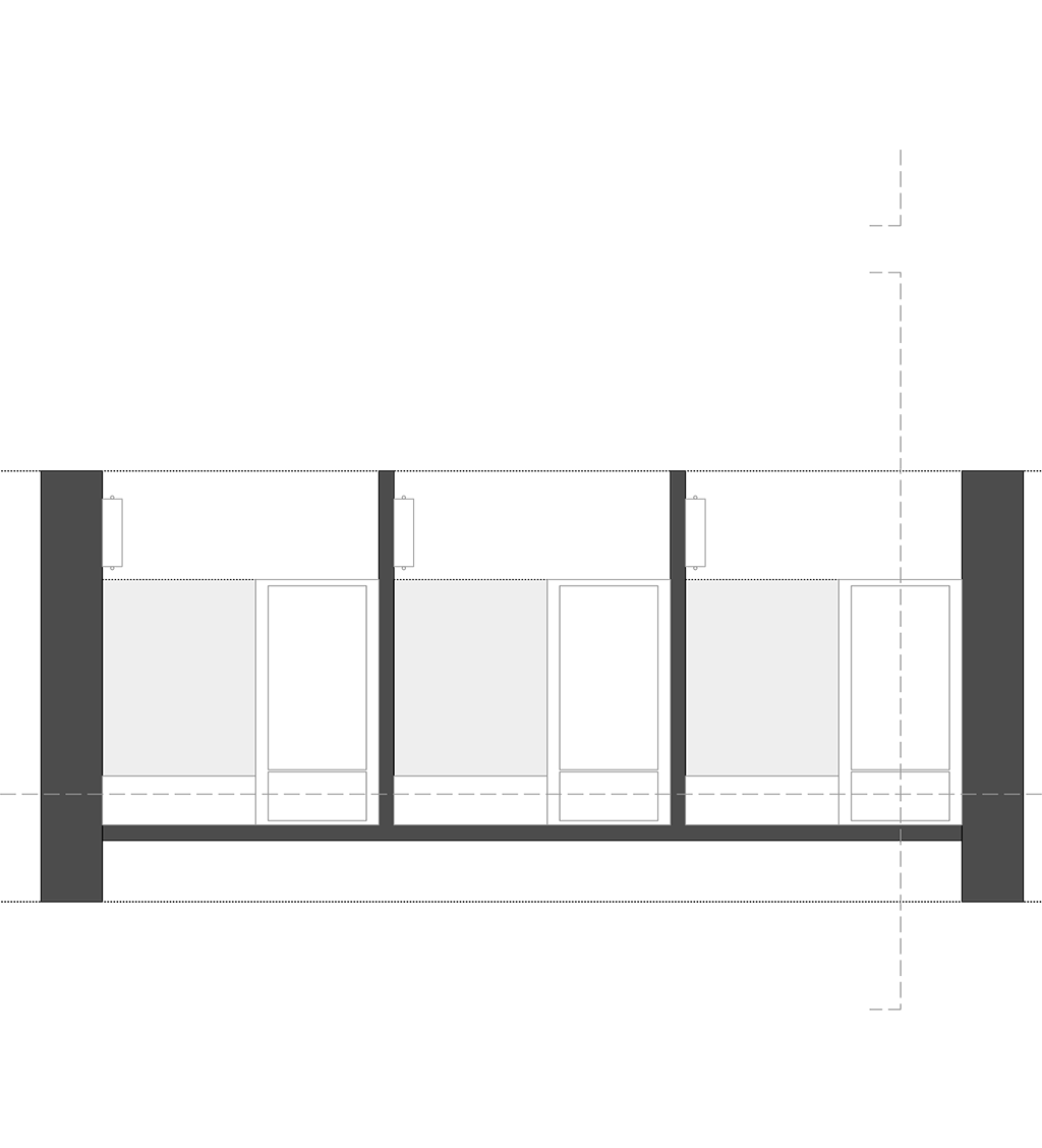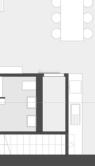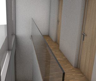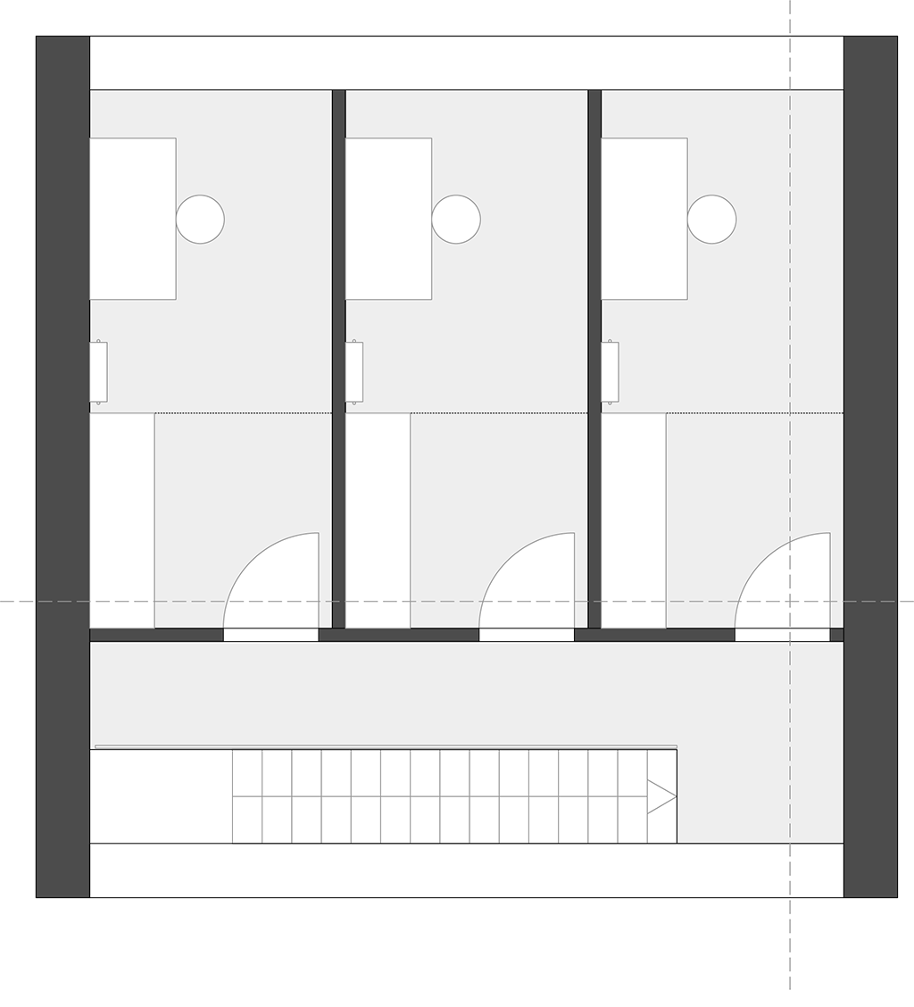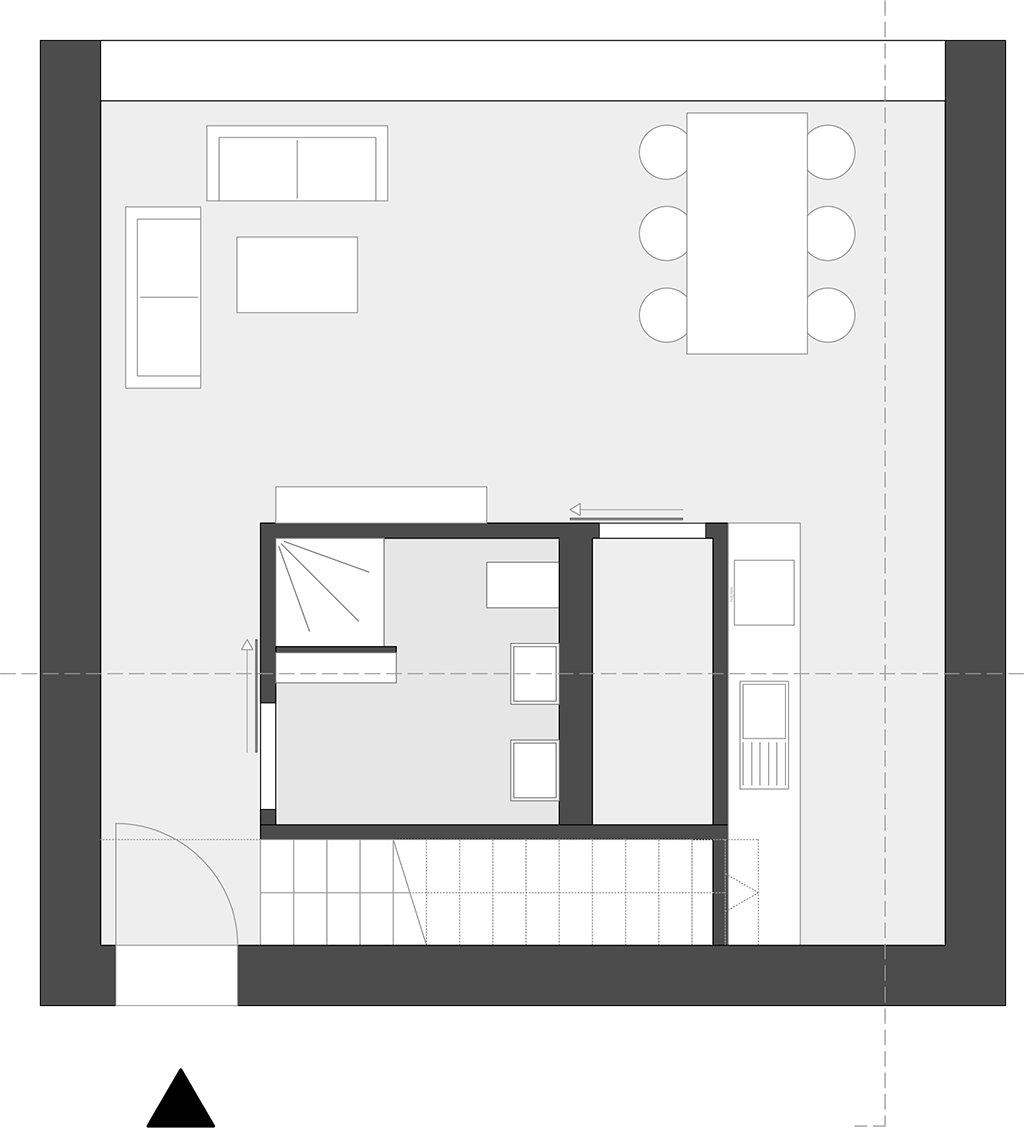 Im 7er Cube ist Platz für 3 Studenten vorgesehen. Auch hier besteht das Erdgeschoss aus Wohn- und Essbereich sowie einem Versorgungsblock mit Küche, Bad und Lagerstätte. Auf der Rückseite des Versorgungsblockes führt eine Treppe in das zweite Geschoss in denen die 3 Zimmer liegen. Auch hier hat jedes Zimmer wieder eine Zwischenebene zum schlafen.