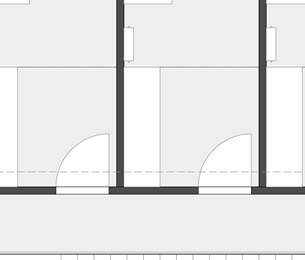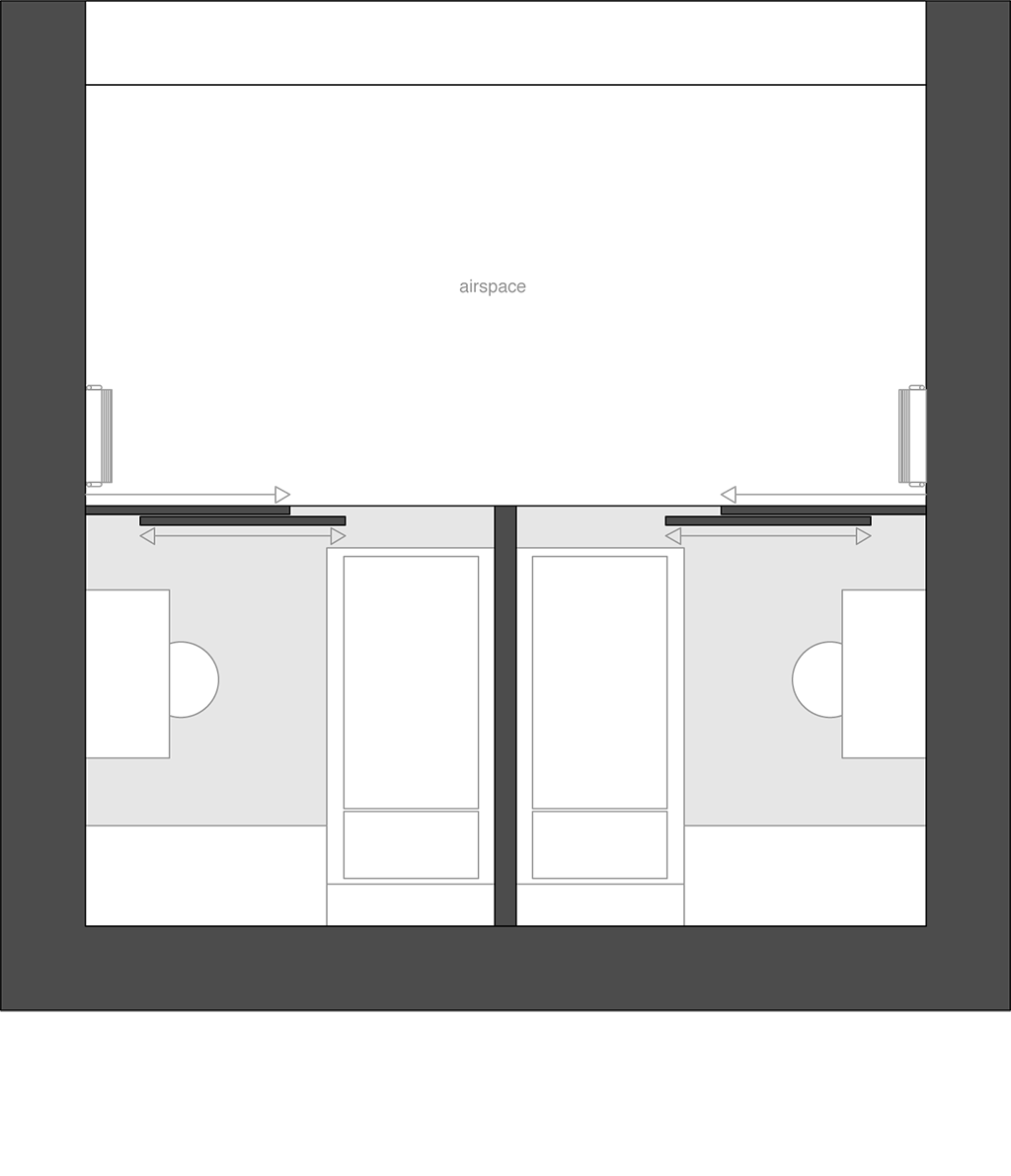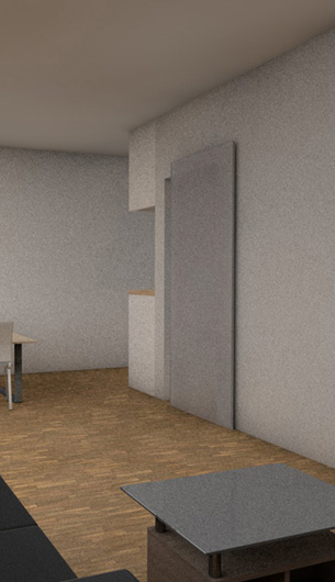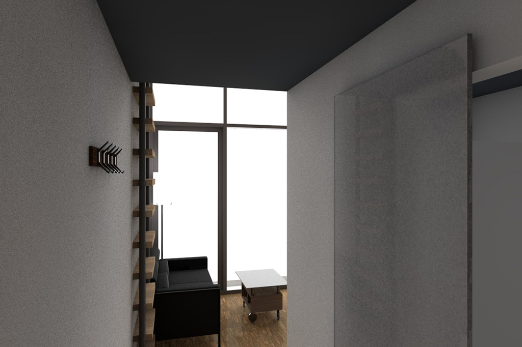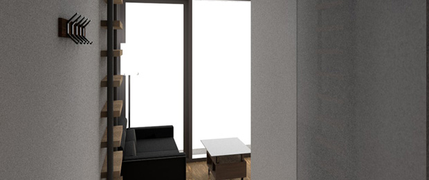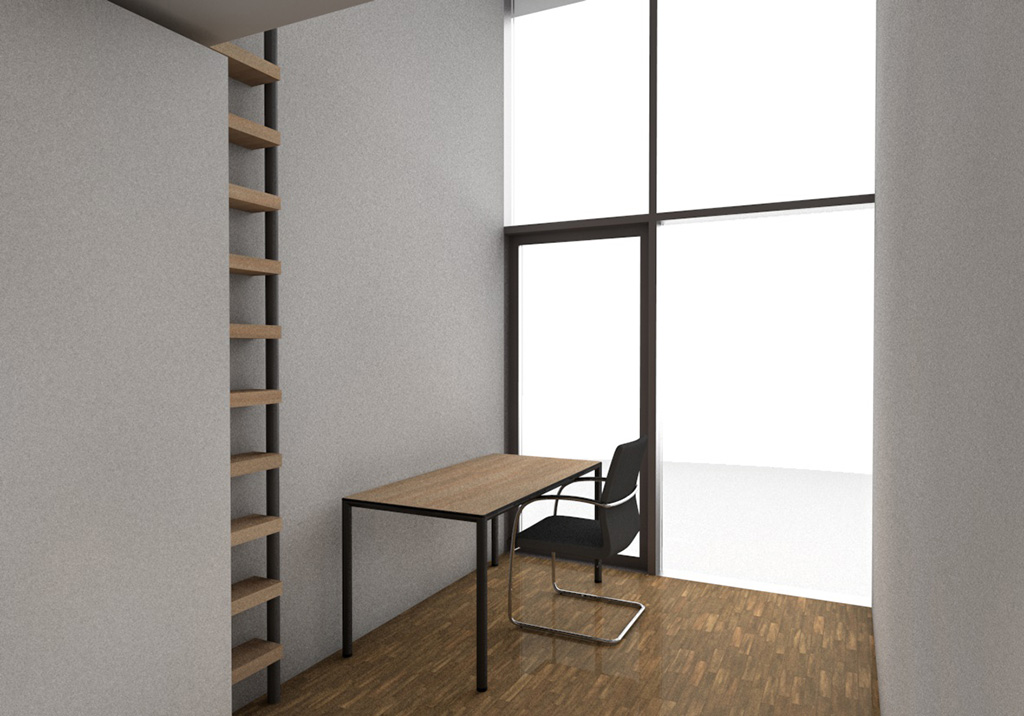 Auf Basis eines 5er und eines 7er Cubes sollte im ersten Schritt optimierte Studentenwohnungen entworfen werden. Der 5er Cube ist für eine 2er WG gedacht und besteht im Erdgeschoss aus einem Wohnbereich sowie einem Versorgungsblocks, der die Kochzeile und das Bad beherbergt. Oberhalb des Versorgungsblockes wurde ein zweites Geschoss geschaffen, der von beiden Bewohnern jeweils über eine separate Leiter erschlossen werden kann. Das zweite Geschoss selbst ist eine nur 6,25 qm Große Fläche auf der ein Kleiderschrank, ein Schreibtisch sowie ein Bett platzt finden. Um eine ausreichende Beleuchtung zu ermöglichen, kann die Ebene mit zwei Schiebeelementen zum Wohnbereich hin geöffnet, aber auch geschlossen werden.