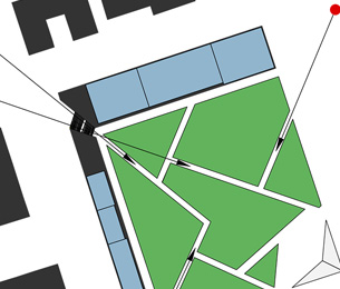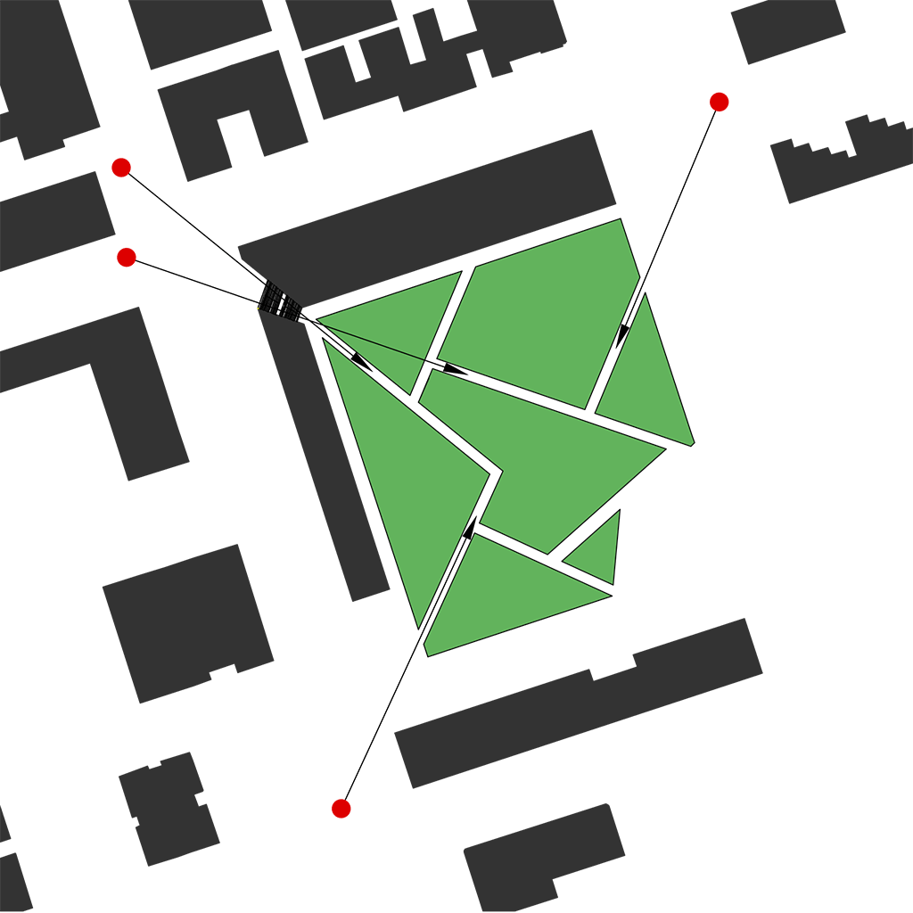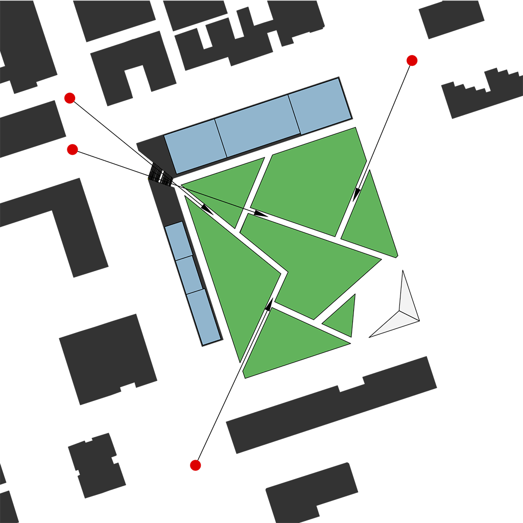 Der Platzgestaltung wurde eine Bewegungsanalyse der verschiedenen Knotenpunkte des Campus Nord zu Grunde gelegt und anhand dessen der Platz aufgeteilt. Um den Besucher zum Verweilen wird er durch den Platz geführt und hat keine Möglichkeit direkt den Platz zu überqueren. Im Zentrum des Platzes wurde weiterhin ein Wasserbecken geschaffen, das als Ruhe Pol dient. Im Südöstlichen Bereich wird ein Sonnensegel aufgebaut um im Sommer auch im Schatten verweilen zu können.
